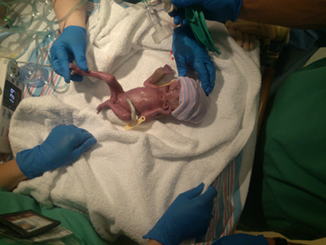About ten NICU doctors and nurses waiting for Xavier stood behind the operating table. Behind them a work station prepped to dry Xavier, keep him warm and keep him breathing. Meanwhile, Rebecca nearly fell asleep twice; at one point she could feel the doctors shifting her organs around, but no pain. Behind us stood one of the anesthesiologists. At 11:40, he told me to stand up and watch.