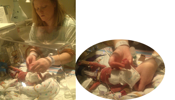 A very focused Rebecca changes Xavier's diaper. The diapers are weighed before they are thrown out. They doctors measure how much fluid goes in and how much comes out. this helps the doctors understand how Xavier is doing with his liquid intake.
