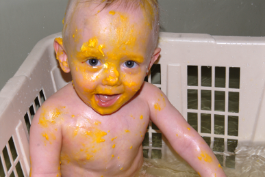 It snowed all day Sunday, so we weren't able to use the hose to clean him up (just kidding). Charged with a sugar rush, it's off to the bath. Rebecca carried him in after putting on an apron. The waters ran yellow, and after a good scrubbing and his splashing around a while, the towel he dried off with still came away with yellow stains.