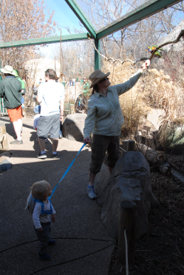 Shortly after staring our self-paced tour, we came to one of the zoo's interactive exhibits: the lorikeets. The lorikeets were in an outdoor exhibit; entry was gained through a double set of doors. On the way in, for $1.00 you could purchase a cup of nectar and feed the lorikeets. We arrived at a great time as the birds were hungry. Though Xavier did not feed any directly (the birds would have swiped the cup from him and flown off), he did enjoy watching these colorful birds up close (most were tame enough, you could stroke their feathers if you moved gently enough).