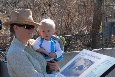 When let off his leash, Xavier headed straight for the sand area, and straight for a shovel. He pushed the shovel into the sand like he knew what he was doing, then assisted a little girl about his age in filling her bucket with sand. I was unable to get Xavier to take interest in the sand sifters, but he did unearth a plastic spoon. Throwing aside his big shovel (perhaps so as not to damage any buried archaeological discoveries with it), he proceeded to fill buckets with sand, scooping the sand with the plastic spoon. It was his prize of the dig.