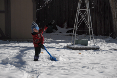 Easily conquering the eight feet of sidewalk, both mom and son set out to shovel the lawn. Xavier really got into this activity. He did not yet realize what mom intended, however.