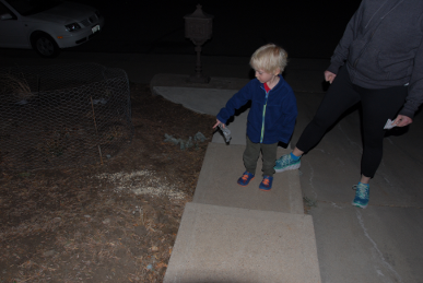 We waited until the sun had set and dusk had passed. Xavier thought it best to pour out the food in the front garden. So, that is what we did. After spreading the food out, Xavier had a little excitement, then wanted to return to the house.