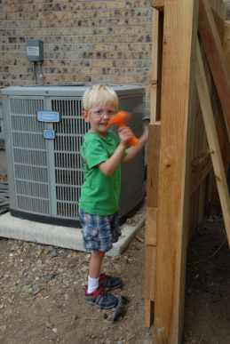 While Dad used his four foot level and pneumatic nailer, Xavier used his Home Depot toy level and toy hammer. He even used the drill his Aunt Kathy gave him this past Christmas. (that night, after cleaning up, we had to build a nailer and an air compressor out of Tinker Toys).
