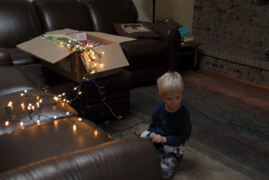 We got as far as we could with the tree, but Xavier remained unsatisfied. He plugged the lights still in the boxes in. Every time I walked passed (or tripped) over the cords, I unplugged them, only to find them plugged in again shortly thereafter.